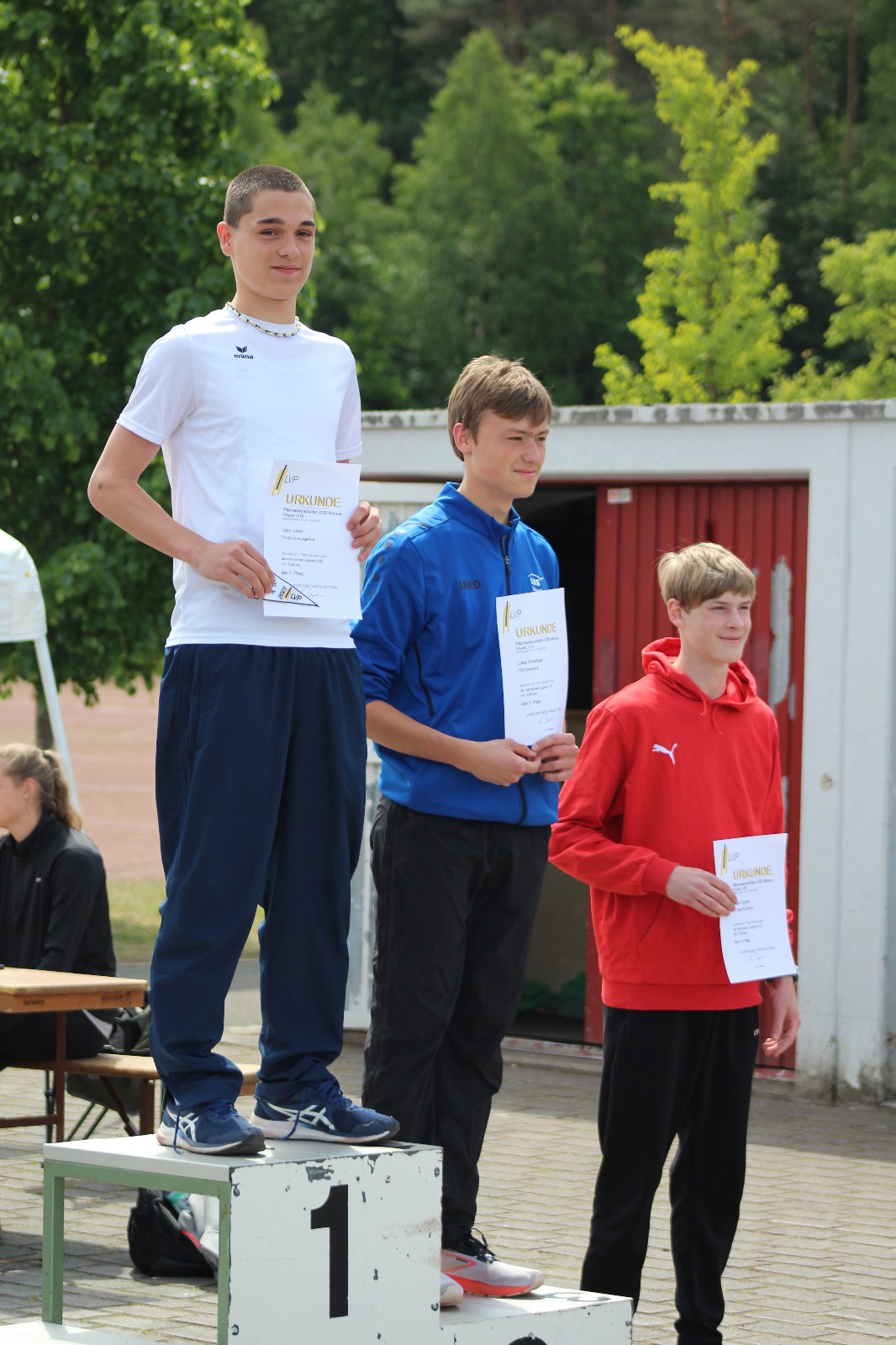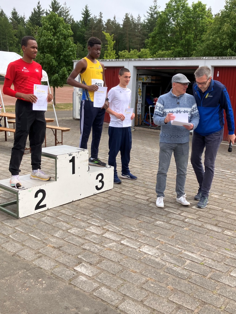 Am Samstag waren mit Leon Loren und Kai Hinke zwei Sportler in der Klasse U18 am Start. Ein Titel und fünf persönliche Bestleistungen waren die Ausbeute. Leon konnte sich im 110m Hürdenlauf auf ausgezeichnete 15,30 sec steigern und teilte sich hier den Titel mit Anton Seitz vom TV Nussdorf. Im 100m Sprint konnte er er sich zweimal steigern und belegte im Endlauf mit 11,74 sec den vierten Rang. Kai steigerte sich im Vorlauf auf 12,57 sec. Im Kugelstoßen übertraf Leon mit 10,23 m zum ersten Mal die 10m Marke und wurde Dritter. Kai konnte sich auch im Weitsprung steigern und belegte im Endkampf mit 5,37m den 8. Rang. Im Hochsprung kam er mit 1,63m auf den dritten Rang.