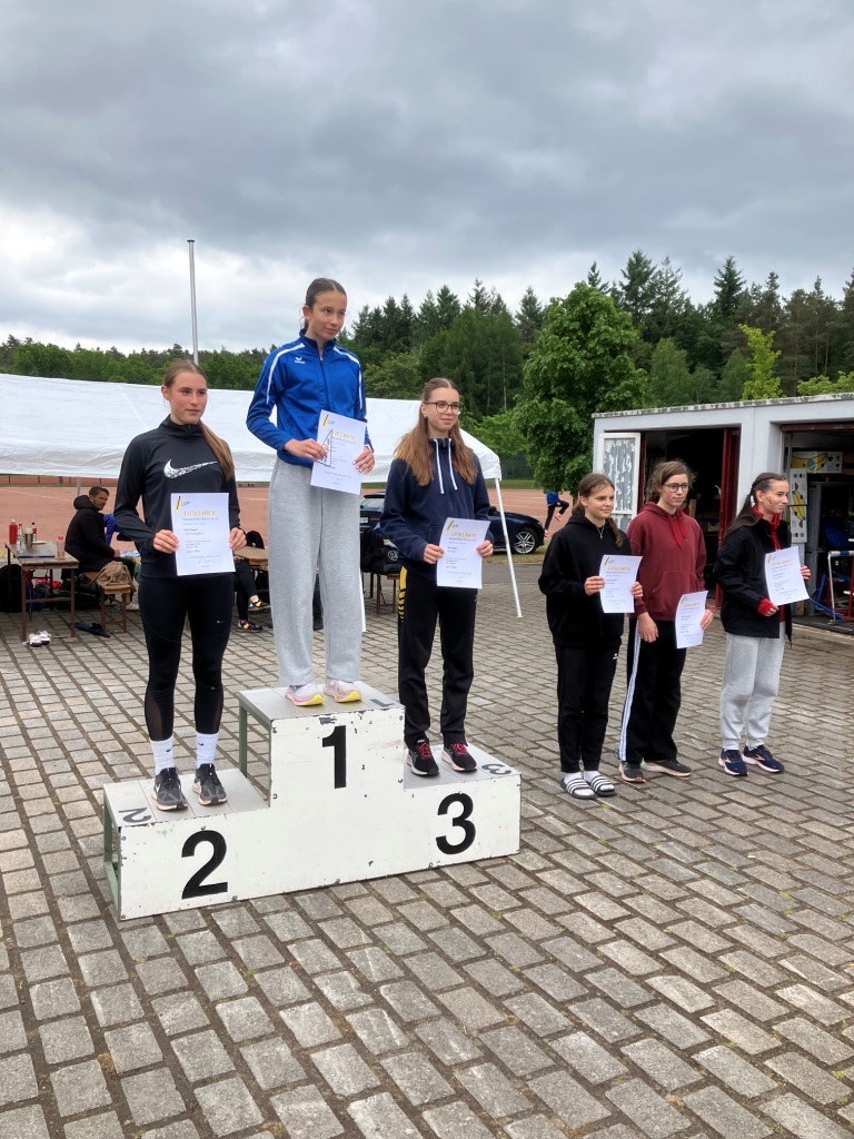 Wie es am Samstag begann, ging es am Sonntag in der Frühe weiter. Als erste Athletin der TG 04 ging in der Klasse WJ 14 Milla Biegert über 80m Hürden an den Start. In einem bravourösen Lauf konnte sie ihre bisherige Bestleistung um 1,5 sec verbessern und belegte knapp geschlagen den zweiten Platz. Sie verfehlte damit die Norm für die Süddeutschen Meisterschaften um winzige 2 Hundertstel Sekunden. Weiter ging es mit den 100m. Milla Schwind und Milla Biegert erzielten im Vorlauf mit 14,35 sec und 13,76 sec sehr gute Zeiten. Milla Biegert erreichte damit den Endlauf wo sie sich auf 13,59 sec verbessern konnte was für Rang vier reichte und zugleich die Qualifikation für die Süddeutschen Meisterschaften bedeutete. Leider wurde Helena Rassl in diesem Rennen wegen eines Fehlstarts disqualifiziert. Im Rennen der WJ 15 erzielten Mia Baumann mit 14,32 sec und Lena Schönmann mit 15,09 sec ebenfalls persönliche Bestleistungen. Im Weitsprung der W14 reichte es für Milla Biegert mit 4,64m als Dritte auf das Treppchen. Helena Rassl wurde um einen Zentimeter knapp geschlagen. 4,63 m reichten für den vierten Platz. Im Feld verpasste Milla Schwind mit 4,18m den Endkampf nur knapp. Bei den W 15 verpasste Mia Baumann den Endkampf ebenfalls nur knapp.
