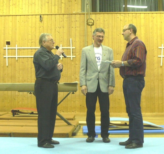 Mit großer Freude nimmt Papa Stefan Böhm die Ehrung aus der Hand des Ehrenauschussvorsitzenden Wolfgang Müller und des Vereinsvorsitzenden Wolfgang Böhm entgegen.